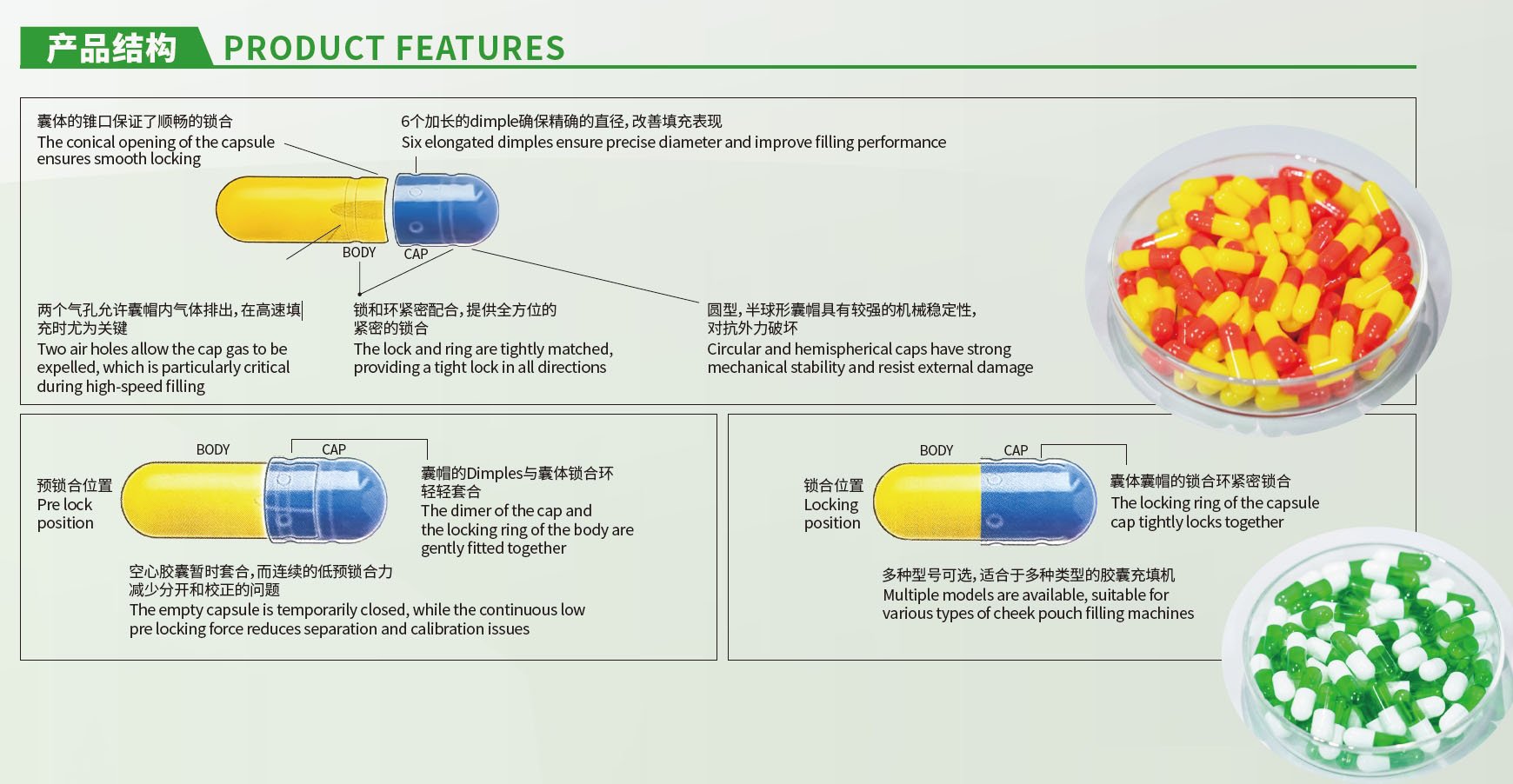 空心膠囊由藥用明膠加輔料精制而成的帽、體兩節(jié)膠囊殼組成。主要用于盛裝固體藥物。如自制散劑、保健品、藥劑等,為服用者解決了難入口、口感差的問題,實現(xiàn)了良藥不再苦口??招哪z囊越來越受歡迎,首先膠囊的形狀細長,易于吞服,是最受消費者歡迎的劑型;此外,膠囊能夠很有效地掩蓋內(nèi)容物的令人不舒服的味道和氣味。膠囊的尺寸有多種多樣,包括00號加長和5號膠囊。膠囊上還可印上文字、商標和圖案,呈現(xiàn)出獨特的定制外觀。